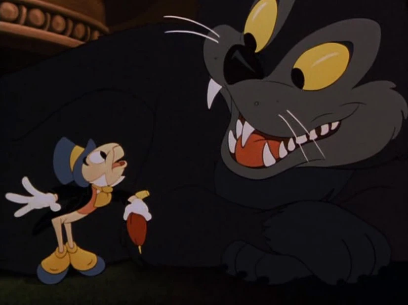 Jiminy Cricket sings the song "I'm a Happy-Go-Lucky Fellow", but wakes the big cat up, and stops singing. Jiminy thinks that the cat bet he will find trouble. The cat meows furiously and chases Jiminy, who is so scared that he fears that he is about to get eaten. Jiminy runs away from the cat, who chases after him. Jiminy runs as fast as he can and finally runs inside the darkness of a strange room and slams the door at the cat. Jiminy is finally inside, but knows that the cat is still behind the door, and scowls at Jiminy. Then Jiminy makes a decision, and pretends to be an angry dog, and barks out loud at the cat, who screeches, and flees in fright. At last, Jiminy is safe.